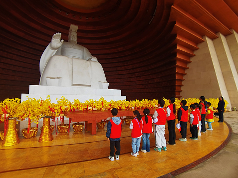最令小记者们震撼的,是景区核心区域的拜祖广场。讲解员介绍,作为全球华人拜祖祈福的重要场所,这里每年农历三月三都会举办黄帝故里拜祖大典,这一活动已被列入国家级非物质文化遗产名录。据公开数据显示,2023年拜祖大典吸引超6300万人次在线参与,全球全网相关话题点击量突破20亿次,成为传递“同根同祖同源,和平和睦和谐”理念的文化纽带。听到这里,小记者们频频点头,眼神里满是惊叹,亲身感受文化盛典背后的民族凝聚力。