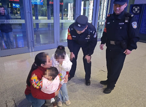 执勤民警在候车大厅发现一名与家人走散的小女孩。女孩眼里含泪,民警蹲下身轻声安抚,并通过广播和站内监控迅速联系到其母亲。当母女重逢时,焦急的母亲连连道谢:“真的太感谢你们了!”