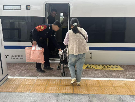 一位年轻妈妈一手抱着婴儿,一手推着婴儿车,还带着一个大行李袋,在进站口步履维艰。执勤民警见状立即上前,主动帮忙提起行李,一路护送母子通过安检,并将他们安全送达站台。看着热心的民警,这位妈妈连声道谢:"出门在外一个人,带着孩子行李真是不容易,感谢你的帮忙,让我方便很多。"民警微笑回应:"这是我们应该做的,祝您旅途愉快!